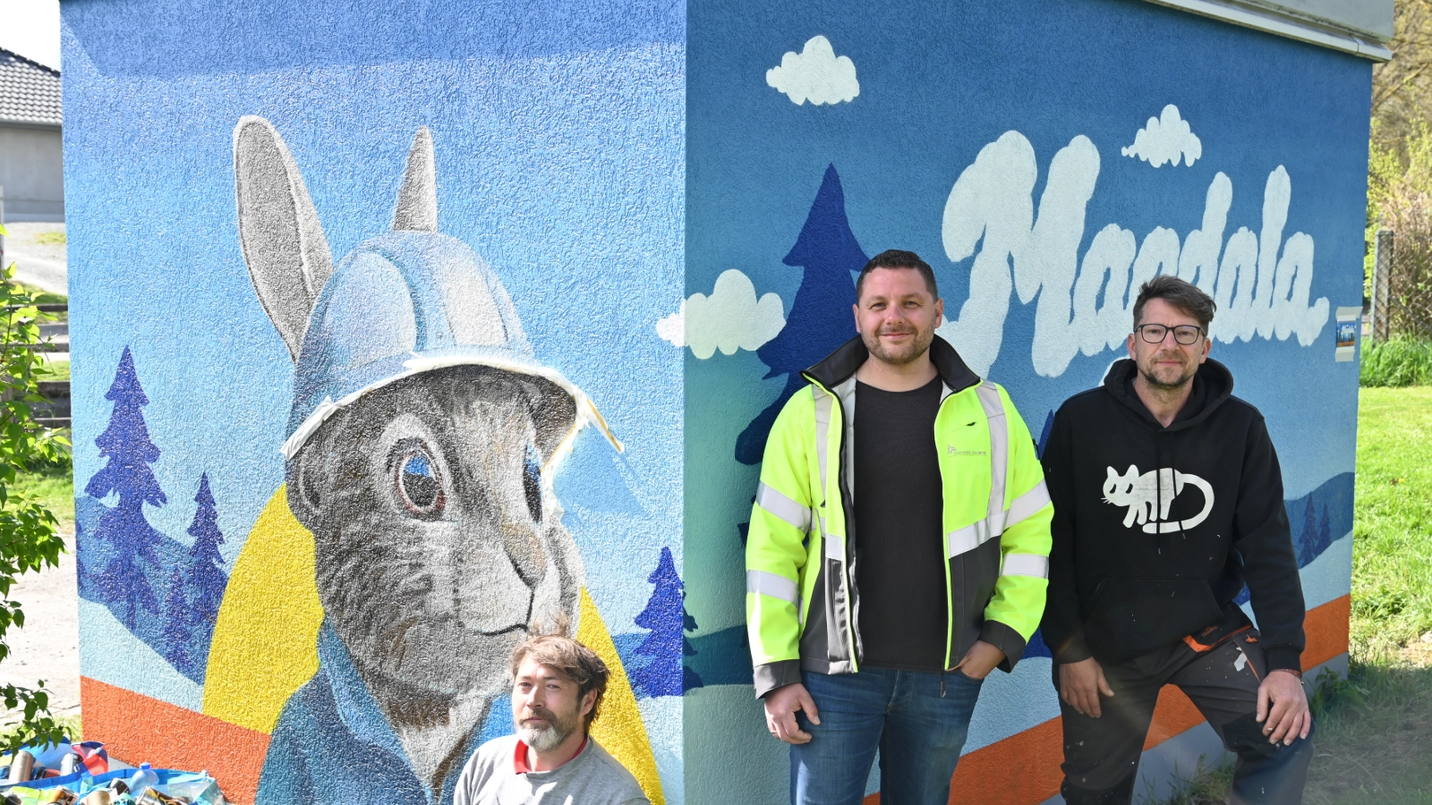 Als eine der ersten Anlagen haben die Graffiti-Künstler Michael Drosdek von der Agentur Farbgefühl und Marko Kurth von der Agentur Heimatkiosk die Trafostation in der Johannisstraße in Magdala fertiggestellt: Hier grüßt nun ein niedliches Häschen mit Stadtwerke-Helm die Passanten, freundlich umwölkt von einem Magdala-Schriftzug.